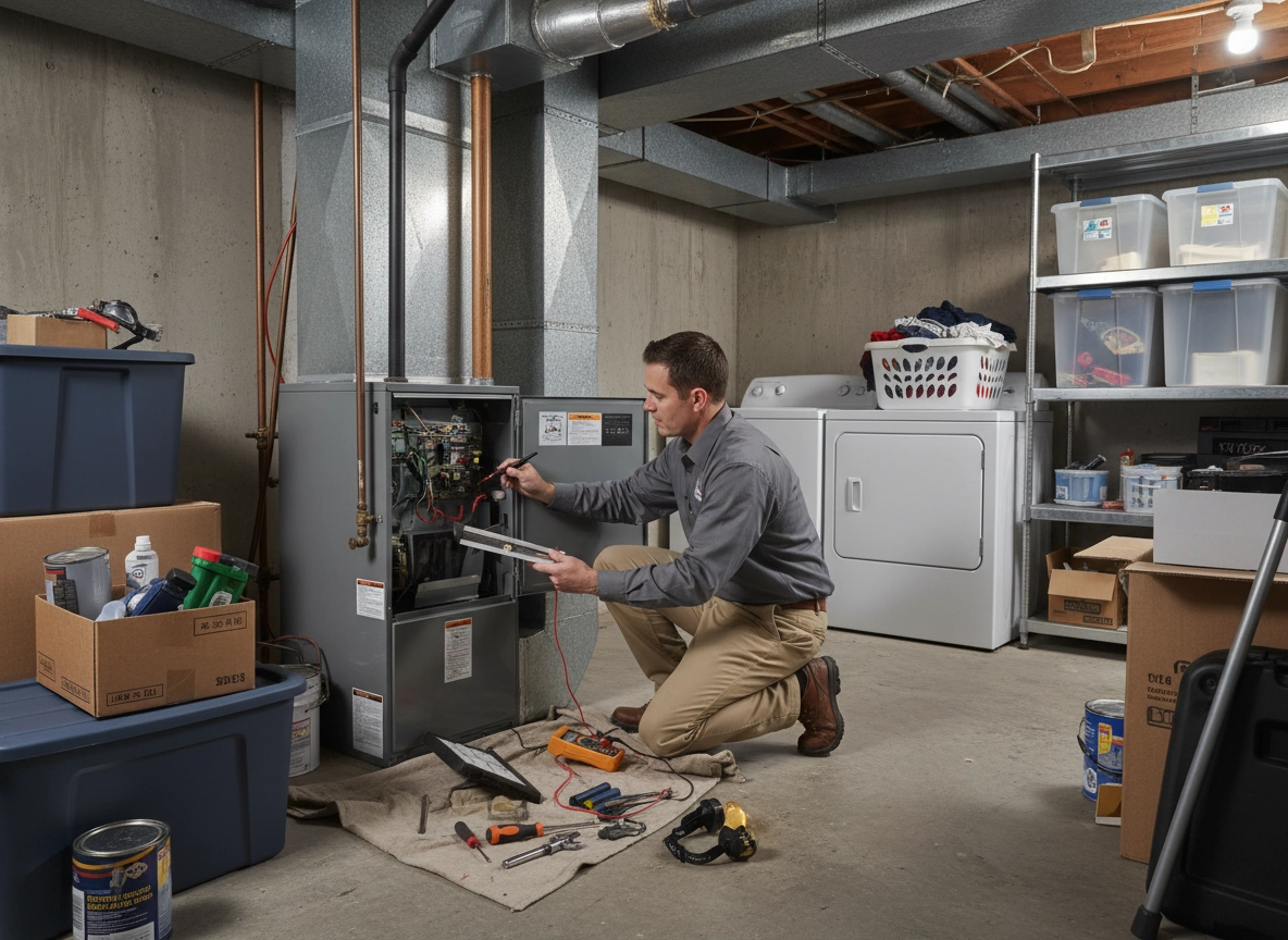 HVAC technician inspecting furnace electricals and airflow before heavy winter use